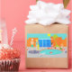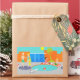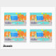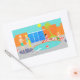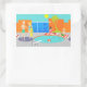 Come on in! The water is fine! These Retro Pool Party Stickers feature a vibrant, cartoon drawing of a fun and sophisticated pool party. The mid century modern design centres around a round swimming pool on a large, grey, concrete patio. The pool is filled with turquoise water. Orange brickwork surrounds the pool and there is a white, plank diving board all ready for an adventurous soul. A red and white beach ball is floating in the water. On the opposite side of the pool, two party-goers are dangling their feet in the water, while resting on red and white striped beach towels. The woman with black hair is wearing a pink, one-piece swimsuit. Beside her is a tropical drink in a coconut with a little umbrella and a green straw. The blonde man is wearing bright, green trunks. He is kicked backed with his hands behind his head. To the left of the pool, is a distinguished man with white hair and jade swim trunks holding a drink in a coconut shell. We know he's distinguished because he's a man with white hair! He is talking to a woman with blonde hair and an hourglass figure wearing a turquoise swimsuit. Slung across her arm is a yellow beach towel> Behind this scene is the green silhouette of a palm tree and a futuristic, orange, brick house. Through the large, floor to ceiling, blue glass windows, you can see the silhouette of a television, chair, ottoman, and starburst clock. The sky behind the house is a cloudless turquoise with a round, yellow sun.