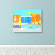 Come on in! The water is fine! This Retro Pool Party Stretched Canvas Print features a vibrant, cartoon drawing of a fun and sophisticated pool party. The mid century modern design centres around a round swimming pool on a large, grey, concrete patio. The pool is filled with turquoise water. Orange brickwork surrounds the pool and there is a white, plank diving board all ready for an adventurous soul. A red and white beach ball is floating in the water. On the opposite side of the pool, two party-goers are dangling their feet in the water, while resting on red and white striped beach towels. The woman with black hair is wearing a pink, one-piece swimsuit. Beside her is a tropical drink in a coconut with a little umbrella and a green straw. The blonde man is wearing bright, green trunks. He is kicked backed with his hands behind his head. To the left of the pool, is a distinguished man with white hair and jade swim trunks holding a drink in a coconut shell. We know he's distinguished because he's a man with white hair! He is talking to a woman with blonde hair and an hourglass figure wearing a turquoise swimsuit. Slung across her arm is a yellow beach towel> Behind this scene is the green silhouette of a palm tree and a futuristic, orange, brick house. Through the large, floor to ceiling, blue glass windows, you can see the silhouette of a television, chair, ottoman, and starburst clock. The sky behind the house is a cloudless turquoise with a round, yellow sun.