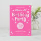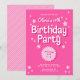 This retro inspired birthday party invitation features a bright pink background, retro inspired typography. The back has the same bright pink colour with a white diagonal stripe pattern. The look is feminine and fun!