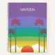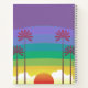 Modern colorful personalised notebook with retro style sunset and palm trees art.