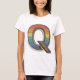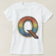 This eye-catching t-shirt design features the letter "Q" adorned with a vibrant rainbow gradient. The letter "Q" is outlined in a vintage style with a black border, and its body is filled with horizontal stripes transitioning through a spectrum of colours from red, orange, yellow, green, blue, to purple. The inner part of the letter has a detailed dot pattern that adds texture and depth to the design. This design combines a retro aesthetic with a modern twist, making it a unique and stylish addition to any wardrobe.