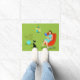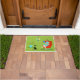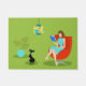 This Retro Reading Woman Door Mat features a 1960's style, minimalist art, cartoon drawing of a woman who has her priorities in order. This delightful bookworm is entranced in a real page-turner. The shapely brunette is wearing an aqua dress and red glasses, while holding a blue book. She is seated in a comfy, red egg chair. In front of her, a sleek, black cat in a teal collar is enjoying the peace and quiet that comes from living with a bibliophile. Both woman and cat are in a stylish green room. Overhead, there is a kitschy pendant lamp in shades of yellow and turquoise. To the side, there is a lush, tropical, potted plant in an aqua flowerpot. Kitty, if you need something, you'll have to wait until she finishes this chapter!