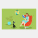 These Retro Reading Woman Stickers feature a 1960's style, minimalist art, cartoon drawing of a woman who has her priorities in order. This delightful bookworm is entranced in a real page-turner. The shapely brunette is wearing an aqua dress and red glasses, while holding a blue book. She is seated in a comfy, red egg chair. In front of her, a sleek, black cat in a teal collar is enjoying the peace and quiet that comes from living with a bibliophile. Both woman and cat are in a stylish green room. Overhead, there is a kitschy pendant lamp in shades of yellow and turquoise. To the side, there is a lush, tropical, potted plant in an aqua flowerpot. Kitty, if you need something, you'll have to wait until she finishes this chapter!