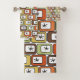 This towel set has a mid-century modern design of rounded rectangles in green, gold, orange, or brown with starbursts inside. If you like the design but prefer different colours, message me.