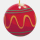 Vintage illustration Merry Christmas holiday party design featuring red and green round hanging glass ornaments. They are decorated with yellow decorative swirls, stripes and diamond shapes. Classic retro 50s kitsch.