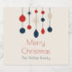 Cute retro Merry Christmas party beer bottle label with vintage 70 style ornaments in red, blue, and ivory above your family name. Beautiful nostalgic holiday party labels.