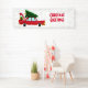 A banner with a cool old red car carrying a green christmas pine tree on its roof and a present tucked away in the open trunk.