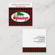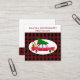 Business cards with a cool old red car carrying a green christmas pine tree on its roof and a present tucked away in the open trunk.