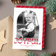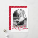 Cute holiday photo card featuring your vertical photo inside of a white arch frame. "Joyful" is displayed in fun, red retro lettering with your name and the year shown below. The retro Christmas card reverses to display a red and white diagonal stripe pattern.