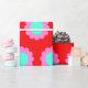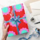 This vibrant and playful wrapping paper features a fun pattern of mod 60s boho pop flowers in pink and turquoise on a red background.