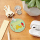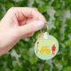 A retro looking robot standing next to a yellow car. This design looks really effective on this Keychain