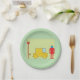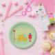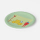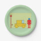 A retro looking robot standing next to a yellow car. This design looks really effective on this Paper Plates