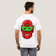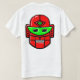 A robot head in red with a stylish green crescent shaped eye panel, a green third eye, with white teeth and highlights. He has a kind of odd sort of grin like he's discovered the wonders of some revolutionary new motor oil. From an original vector drawing by N.A. Berry. The motif is repeated on both the back and the front.