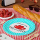 Such a cute design in red, turquoise blue and white with sweet red love hearts and polka dot graphics Just the thing for a wedding table with a Rockabilly theme.