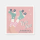 Cute blush pink roller skating birthday party napkins featuring a retro-inspired illustration of teal blue roller skates on a girl wearing pink-striped tube socks and "Let's Roll" in a 70's style script. Add her name dark teal blue typography.