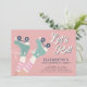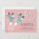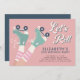 Cool blush pink roller skating birthday party invitation for any age featuring "Let's Roll!" in a 70's style script and a retro-inspired illustration of roller skates on a girl wearing pink-striped tube socks. Add her name and birthday year in dark teal blue typography.