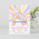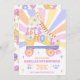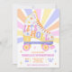 A fun and bright retro inspired roller skate design in the colour palette pastel pink, orange, purple and yellow. On the front is a white roller skate with the text 'Let's Roll' in a retro script with a rainbow burst behind it, and on the back is a fun bright pattern of roller skates. Customise the details for your party! See the whole matching party collection.