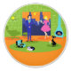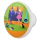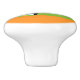 This Retro Romantic Evening Couple Ceramic Pull looks like a scene out of a 1960's romantic comedy. The minimalist design features an attractive cartoon couple in the living room of a mid century modern, urban apartment. The room prominently features a green, stone wall with a floor to ceiling window with a view. Through the window, we can see the blue silhouette of a big city skyline. A crescent moon is just visible in the orange sky of sunset. The furnishings in the room include a green, lounge chair with matching footstool, a yellow, sputnik light fixture, and a turquoise, cone shaped fireplace, complete with roaring fire. In the centre of the orange flooring, there is a round, green shag rug. A portable, turquoise and black record player is placed on the rug. Next to the record player, a vinyl record can be seen poking out of a kitschy album cover. Also on the rug, there is a sleek, black cat wearing a teal collar. This fancy feline is sitting in front of a martini glass. Enjoying this scene, we have a very sophisticated couple. There is a suave man wearing a blue suit, light blue shirt and red tie. The tall, dark and handsome man is enjoying the company of an elegant blonde woman. The lovely lady is wearing a hot pink dress with a form fitting bodice and flared skirt. They are each holding a crystal martini glass with a floating olive. Cheers! Here's to the perfect evening at home!