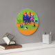 This Retro Romantic Evening Couple Round Wall Clock looks like a scene out of a 1960's romantic comedy. The minimalist design features an attractive cartoon couple in the living room of a mid century modern, urban apartment. The room prominently features a green, stone wall with a floor to ceiling window with a view. Through the window, we can see the blue silhouette of a big city skyline. A crescent moon is just visible in the orange sky of sunset. The furnishings in the room include a green, lounge chair with matching footstool, a yellow, sputnik light fixture, and a turquoise, cone shaped fireplace, complete with roaring fire. In the centre of the orange flooring, there is a round, green shag rug. A portable, turquoise and black record player is placed on the rug. Next to the record player, a vinyl record can be seen poking out of a kitschy album cover. Also on the rug, there is a sleek, black cat wearing a teal collar. This fancy feline is sitting in front of a martini glass. Enjoying this scene, we have a very sophisticated couple. There is a suave man wearing a blue suit, light blue shirt and red tie. The tall, dark and handsome man is enjoying the company of an elegant blonde woman. The lovely lady is wearing a hot pink dress with a form fitting bodice and flared skirt. They are each holding a crystal martini glass with a floating olive. Cheers! Here's to the perfect evening at home!