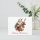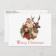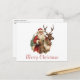 Christmas postcard with a fun Christmas illustration. Santa Claus in his traditional red suit riding a big antlered reindeer decorated with holly. A Christmas tree in the back.