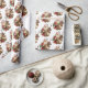 Wrapping paper with a fun Christmas illustration. Santa Claus in his traditional red suit riding a big antlered reindeer decorated with holly. A Christmas tree in the back.