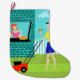 Welcome to Suburbia! This Retro Saturday Morning Christmas Stocking features an attractive minimalist cartoon couple in their little corner of paradise. From the window of a turquoise and teal brick house, we can see Mrs. Homemaker. The beautiful redhead is wearing a hot pink frock. She is holding a pitcher of freshly squeezed lemonade in one hand. On the windowsill in front of her, there is a piping hot, homemade, lattice topped, fruit pie in a green pie plate. Mr. Man of the House is standing on the lush green lawn. He is wearing a blue shorts and a yellow shirt that matches his wife's sunny disposition. He is standing behind a red lawnmower. We can see that he has already mowed a strip of grass, but, at this point, it's difficult to tell if he is working hard or hardly working. The mowing seems to be at a standstill while he enjoys a tangy glass of lemonade. Ah, refreshing! The yellow sun is peeking from behind fluffy, light blue clouds. The sky is the shade of aqua reserved for Hometown, USA in kitschy, mid century modern artwork. The opposite side of the stocking features a teal and turquoise brick pattern.