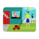 Welcome to Suburbia! This Retro Saturday Morning Flexi Magnet features an attractive minimalist cartoon couple in their little corner of paradise. From the window of a turquoise and teal brick house, we can see Mrs. Homemaker. The beautiful redhead is wearing a hot pink frock. She is holding a pitcher of freshly squeezed lemonade in one hand. On the windowsill in front of her, there is a piping hot, homemade, lattice topped, fruit pie in a green pie plate. On the walkway, in front of the red door to the home, the rolled up Saturday morning newspaper is waiting to be read. Mr. Man of the House is standing on the lush green lawn. He is wearing a blue shorts and a yellow shirt that matches his wife's sunny disposition. He is standing behind a red lawnmower. We can see that he has already mowed a strip of grass, but, at this point, it's difficult to tell if he is working hard or hardly working. The mowing seems to be at a standstill while he enjoys a tangy glass of lemonade. Ah, refreshing! Beside the house, the family feline is perched on a white picket fence. Snowball, the ironically named black cat, is looking down on her loyal subjects and the orange and yellow flowers that border the fence row. The yellow sun is peeking from behind fluffy, light blue clouds. The sky is the shade of aqua reserved for Hometown, USA in kitschy, mid century modern artwork.