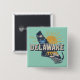 Pin back button features a retro style scenic graphic of Delaware's state silhouette on aqua background.