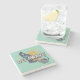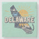 Stylish stone coaster features a retro style scenic graphic of Delaware's state silhouette on aqua background.