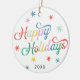 This retro inspired holiday photo ornament features a classic white background with a multi-coloured script greeting which says "Happy Holidays" on the front. This design accommodates a single vertical photo on the front. The back of the card is a single photo, but can be removed if desired.