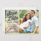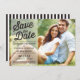 Photo save the date announcement featuring transparent banner with retro typography and a striped background.