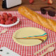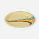 1970's graphic design featured lots of curving stripes in earthy colours. This palette has brown, turquoise, harvest gold and orange against a cream background. The stripes swoop down across the plate as though it were a ski slope, as was common in the 70's.