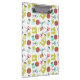A clipboard featuring a sewing themed pattern with illustrations of a sewing machine, pin cushion, fabric swatches, scissors, needle, and spool of thread.