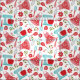 Vintage themed pattern featuring aprons, mixers, kitchen utensils and flowers in shades of pink, red and blue. Perfect for shabby chic kitchen projects.