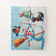 Retro Snowman, Cute Dog, Red Cardinal And Trees Jigsaw Puzzle