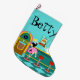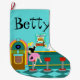 Serve up something special with this Customisable Retro Soda Fountain Christmas Stocking. The minimalist art, cartoon drawing design features the interior of the coolest spot in town. It's a 1950's soda fountain, in all of its kitschy glory! Against the backdrop of an aqua wall, we can see posters advertising the specialities of the house. One poster shows a hamburger and bottle of pop for the bargain price of 15 cents. The other poster shows two scoops of ice cream in a sugar cone for a mere 5 cents. With prices like these, it must be difficult to watch your waistline! A most competent soda jerk is manning the teal counter with yellow accents. The young man with the strong work ethic is holding an ice cream cone with a single scoop of lemon yellow ice cream--although, to be fair, it could be pineapple! The clean-cut lad is wearing a pristine, white shirt with a black, bow tie and a white hat with red accents. On the opposite side of the counter, we see three red and chrome bar stools. Perched on one of the stools is a blonde teenybopper whose mouth is surely watering. It's unclear if her mouth is watering over the ice cream cone that is headed her way or the industrious young man who is serving it. She is wearing a pink poodle skirt and a form fitting black top. Her yellow locks are pulled back in a classic ponytail. Next to this cutie of a customer there is a colourful, classic jukebox, which features brown, wood grain, panelling and colourful neon lights. Better than that, it is sure to feature all of the greatest rock and roll hits of the time! The floor of this mid century modern ice cream parlour is an aqua and teal, chequerboard pattern that is just screaming for someone to try all of the latest dance moves. Personalise for a one of a kind Christmas stocking.