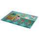 Serve up something special with this Retro Soda Fountain Cutting Board. The minimalist art, cartoon drawing design features the interior of the coolest spot in town. It's a 1950's soda fountain, in all of its kitschy glory! Against the backdrop of an aqua wall, we can see posters advertising the specialities of the house. One poster shows a hamburger and bottle of pop for the bargain price of 15 cents. The other poster shows two scoops of ice cream in a sugar cone for a mere 5 cents. With prices like these, it must be difficult to watch your waistline! A most competent soda jerk is manning the teal counter with yellow accents. The young man with the strong work ethic is holding an ice cream cone with a single scoop of lemon yellow ice cream--although, to be fair, it could be pineapple! The clean-cut lad is wearing a pristine, white shirt with a black, bow tie and a white hat with red accents. On the opposite side of the counter, we see three red and chrome bar stools. Perched on one of the stools is a blonde teenybopper whose mouth is surely watering. It's unclear if her mouth is watering over the ice cream cone that is headed her way or the industrious young man who is serving it. She is wearing a pink poodle skirt and a form fitting black top. Her yellow locks are pulled back in a classic ponytail. Next to this cutie of a customer there is a colourful, classic jukebox, which features brown, wood grain, panelling and colourful neon lights. Better than that, it is sure to feature all of the greatest rock and roll hits of the time! The floor of this mid century modern ice cream parlour is an aqua and teal, chequerboard pattern that is just screaming for someone to try all of the latest dance moves.