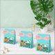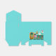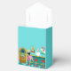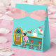 Serve up something special with this Retro Soda Fountain Favour Box. The minimalist art, cartoon drawing design features the interior of the coolest spot in town. It's a 1950's soda fountain, in all of its kitschy glory! Against the backdrop of an aqua wall, we can see posters advertising the specialities of the house. One poster shows a hamburger and bottle of pop for the bargain price of 15 cents. The other poster shows two scoops of ice cream in a sugar cone for a mere 5 cents. With prices like these, it must be difficult to watch your waistline! A most competent soda jerk is manning the teal counter with yellow accents. The young man with the strong work ethic is holding an ice cream cone with a single scoop of lemon yellow ice cream--although, to be fair, it could be pineapple! The clean-cut lad is wearing a pristine, white shirt with a black, bow tie and a white hat with red accents. On the opposite side of the counter, we see three red and chrome bar stools. Perched on one of the stools is a blonde teenybopper whose mouth is surely watering. It's unclear if her mouth is watering over the ice cream cone that is headed her way or the industrious young man who is serving it. She is wearing a pink poodle skirt and a form fitting black top. Her yellow locks are pulled back in a classic ponytail. Next to this cutie of a customer there is a colourful, classic jukebox, which features brown, wood grain, panelling and colourful neon lights. Better than that, it is sure to feature all of the greatest rock and roll hits of the time! The floor of this mid century modern ice cream parlour is an aqua and teal, chequerboard pattern that is just screaming for someone to try all of the latest dance moves.