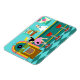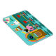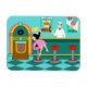 Serve up something special with this Retro Soda Fountain Flexible Magnet. The minimalist art, cartoon drawing design features the interior of the coolest spot in town. It's a 1950's soda fountain, in all of its kitschy glory! Against the backdrop of an aqua wall, we can see posters advertising the specialities of the house. One poster shows a hamburger and bottle of pop for the bargain price of 15 cents. The other poster shows two scoops of ice cream in a sugar cone for a mere 5 cents. With prices like these, it must be difficult to watch your waistline! A most competent soda jerk is manning the teal counter with yellow accents. The young man with the strong work ethic is holding an ice cream cone with a single scoop of lemon yellow ice cream--although, to be fair, it could be pineapple! The clean-cut lad is wearing a pristine, white shirt with a black, bow tie and a white hat with red accents. On the opposite side of the counter, we see three red and chrome bar stools. Perched on one of the stools is a blonde teenybopper whose mouth is surely watering. It's unclear if her mouth is watering over the ice cream cone that is headed her way or the industrious young man who is serving it. She is wearing a pink poodle skirt and a form fitting black top. Her yellow locks are pulled back in a classic ponytail. Next to this cutie of a customer there is a colourful, classic jukebox, which features brown, wood grain, panelling and colourful neon lights. Better than that, it is sure to feature all of the greatest rock and roll hits of the time! The floor of this mid century modern ice cream parlour is an aqua and teal, chequerboard pattern that is just screaming for someone to try all of the latest dance moves.