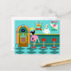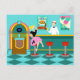 Serve up something special with this Retro Soda Fountain Postcard. The minimalist art, cartoon drawing design features the interior of the coolest spot in town. It's a 1950's soda fountain, in all of its kitschy glory! Against the backdrop of an aqua wall, we can see posters advertising the specialities of the house. One poster shows a hamburger and bottle of pop for the bargain price of 15 cents. The other poster shows two scoops of ice cream in a sugar cone for a mere 5 cents. With prices like these, it must be difficult to watch your waistline! A most competent soda jerk is manning the teal counter with yellow accents. The young man with the strong work ethic is holding an ice cream cone with a single scoop of lemon yellow ice cream--although, to be fair, it could be pineapple! The clean-cut lad is wearing a pristine, white shirt with a black, bow tie and a white hat with red accents. On the opposite side of the counter, we see three red and chrome bar stools. Perched on one of the stools is a blonde teenybopper whose mouth is surely watering. It's unclear if her mouth is watering over the ice cream cone that is headed her way or the industrious young man who is serving it. She is wearing a pink poodle skirt and a form fitting black top. Her yellow locks are pulled back in a classic ponytail. Next to this cutie of a customer there is a colourful, classic jukebox, which features brown, wood grain, panelling and colourful neon lights. Better than that, it is sure to feature all of the greatest rock and roll hits of the time! The floor of this mid century modern ice cream parlour is an aqua and teal, chequerboard pattern that is just screaming for someone to try all of the latest dance moves.
