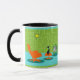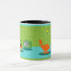 It is said that dogs have owners and cats have staff. The feline on this Retro Space Age Kitty Mug couldn't agree more! The 1960's style, minimalist art design features a sleek, black cat in a mid century modern living room. The sophisticated room prominently features a green, stone wall. The carpet is aqua with teal shadows. The furnishings of the room include a yellow, sputnik light figure, an orange lounge chair with matching footstool and a green television with rabbit ears. The lucky black cat can be seen perched on the footstool in front of the television. Its favourite show is on! On the television screen, we can see a black and white, classic television family solving all of life's problems in a half hour show. This design is purrrfect, if we do say so ourselves.