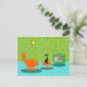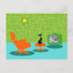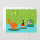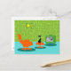 It is said that dogs have owners and cats have staff. The feline on this Retro Space Age Kitty Postcard couldn't agree more! The 1960's style, minimalist art design features a sleek, black cat in a mid century modern living room. The sophisticated room prominently features a green, stone wall. The carpet is aqua with teal shadows. The furnishings of the room include a yellow, sputnik light figure, an orange lounge chair with matching footstool and a green television with rabbit ears. The lucky black cat can be seen perched on the footstool in front of the television. Its favourite show is on! On the television screen, we can see a black and white, classic television family solving all of life's problems in a half hour show. This design is purrrfect, if we do say so ourselves.