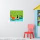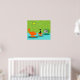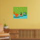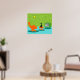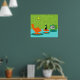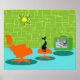 It is said that dogs have owners and cats have staff. The feline on this Retro Space Age Kitty Poster couldn't agree more! The 1960's style, minimalist art design features a sleek, black cat in a mid century modern living room. The sophisticated room prominently features a green, stone wall. The carpet is aqua with teal shadows. The furnishings of the room include a yellow, sputnik light figure, an orange lounge chair with matching footstool and a green television with rabbit ears. The lucky black cat can be seen perched on the footstool in front of the television. Its favourite show is on! On the television screen, we can see a black and white, classic television family solving all of life's problems in a half hour show. This design is purrrfect, if we do say so ourselves.