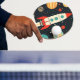 A vibrant retro-themed illustration of a classic rocket ship blasting off into space, surrounded by colourful planets, stars, and cosmic elements. the design uses bold reds, teals, and oranges against a dark starry background, evoking mid-century sci-fi aesthetics. This whimsical and nostalgic artwork is ideal for children. The best part of this ping pong paddle is that you can customise it with your kid's name.