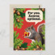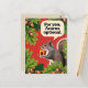 A bushy tailed squirrel holds onto a small gift parcel, surrounded by oak leaves and acorns on a bright red background.