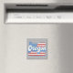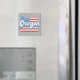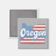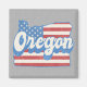 Stylish square fridge magnet features state of Oregon silhouette with patriotic stars and stripes fill on grey Kraft paper background, and retro style text.