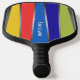 A retro design with a '70s-inspired font and a minimalist striped pattern. In five colourful bright colours on a gradient background, and almost white lettering. Add your name and make it your pickleball paddle.