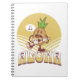 Grunge retro summer illustration with "Aloha" text design and cute pineapple playing ukulele at sunset decoration for summer lovers