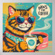 Retro-style cartoon cat wearing oversized sunglasses, holding a coffee cup. Bold 80s-inspired colours (teal, mustard, coral) with a halftone texture background with Playful