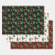 These gift wrapping paper sheets feature a Christmas pattern with a retro style look consisting of Christmas trees, gifts and gold swirls in muted greens, dark red and gold. This set offers the background is black, white and dark red.